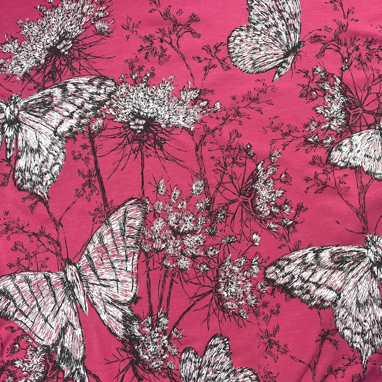 - Pink jersey knit with striking black and white butterfly designs