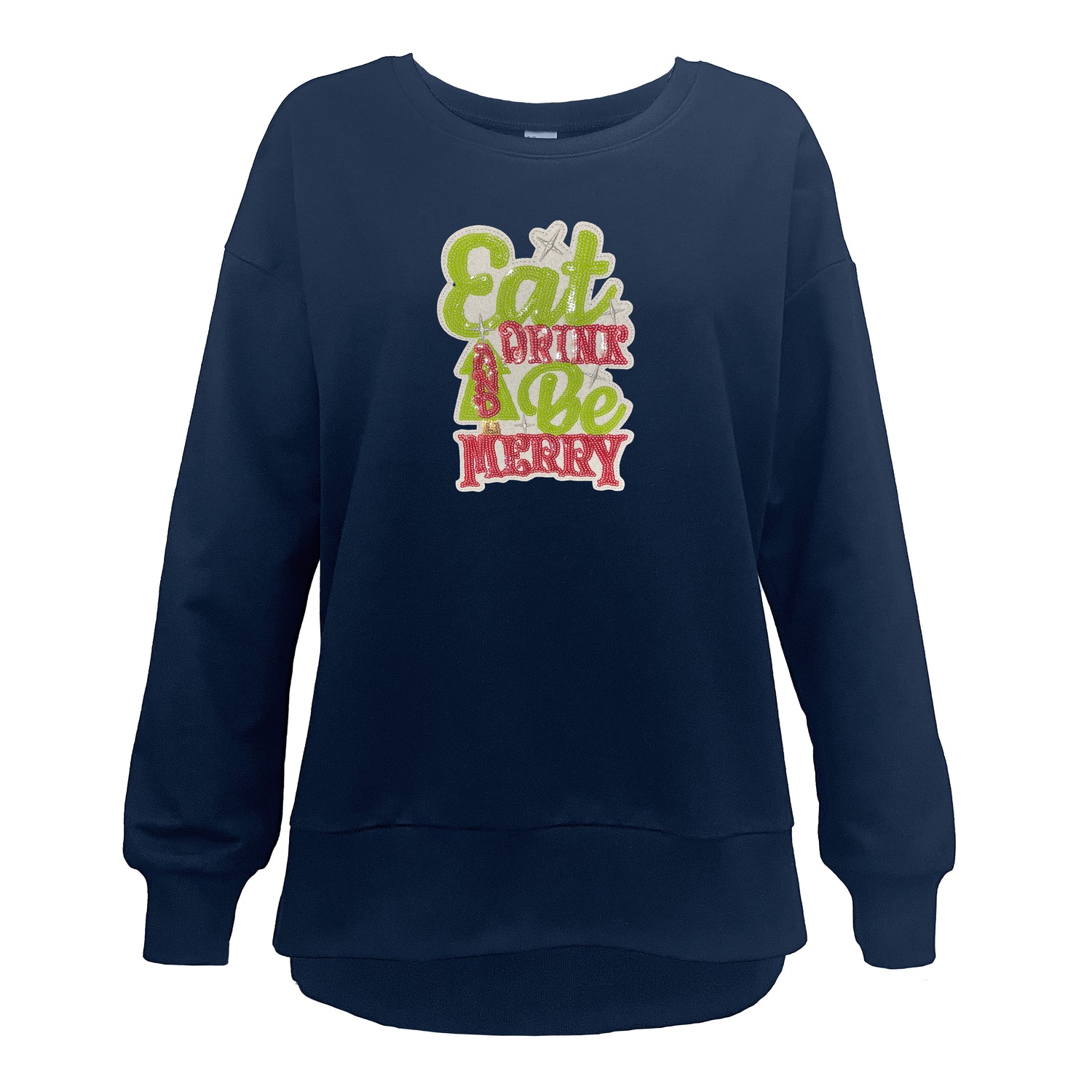 Get into the spirit of the season with this festive navy sweatshirt featuring a sparkly sequin applique that reads “Eat, Drink & Be Merry.” With its bright holiday colors, comfy fit, and playful message, it’s the perfect pick for cookie baking, cocoa sipping, and spreading cheer everywhere you go!