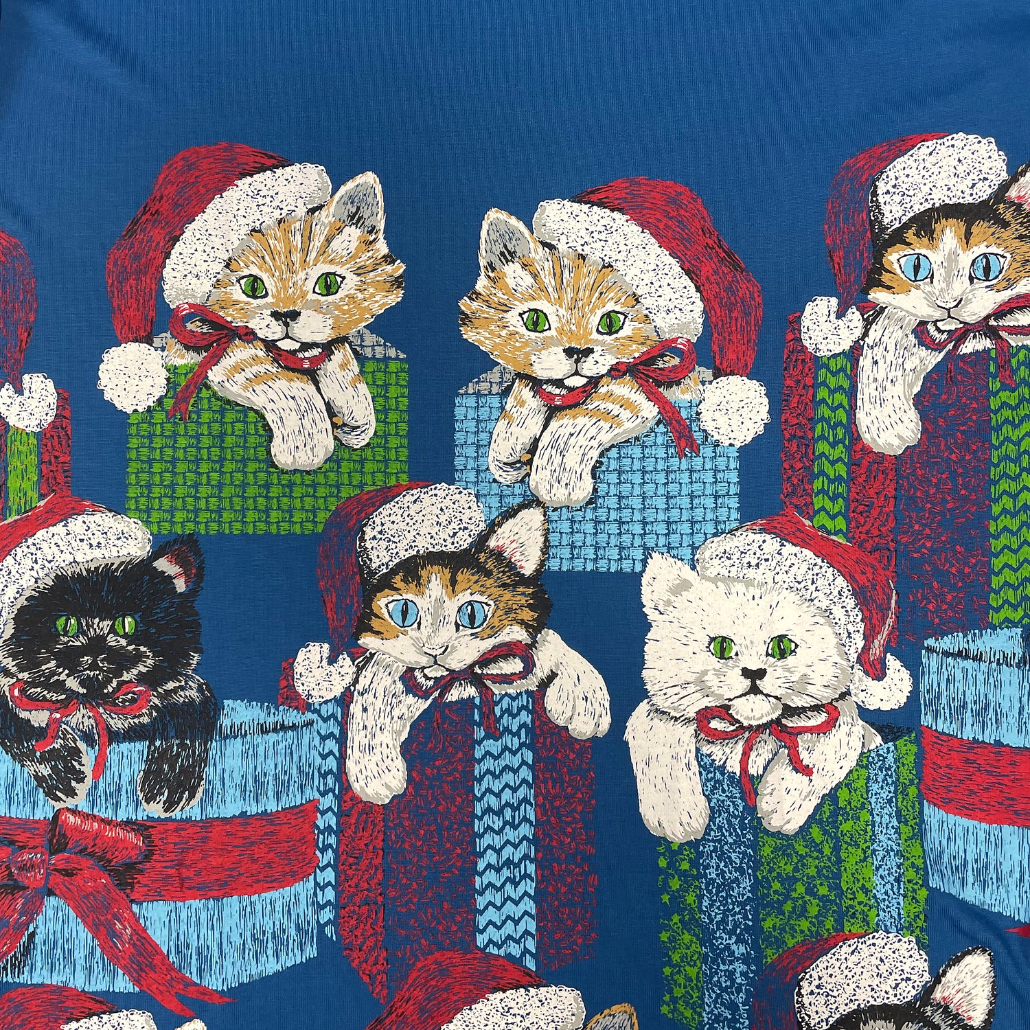 Add a dash of festive cuteness to your wardrobe with our Kitty Presents Kimono! This adorable long sleeve blue kimono features cute kittens wearing festive hats, nestled inside colorful presents. Perfect for adding a playful and heartwarming touch to your holiday style, this kimono is both charming and versatile.