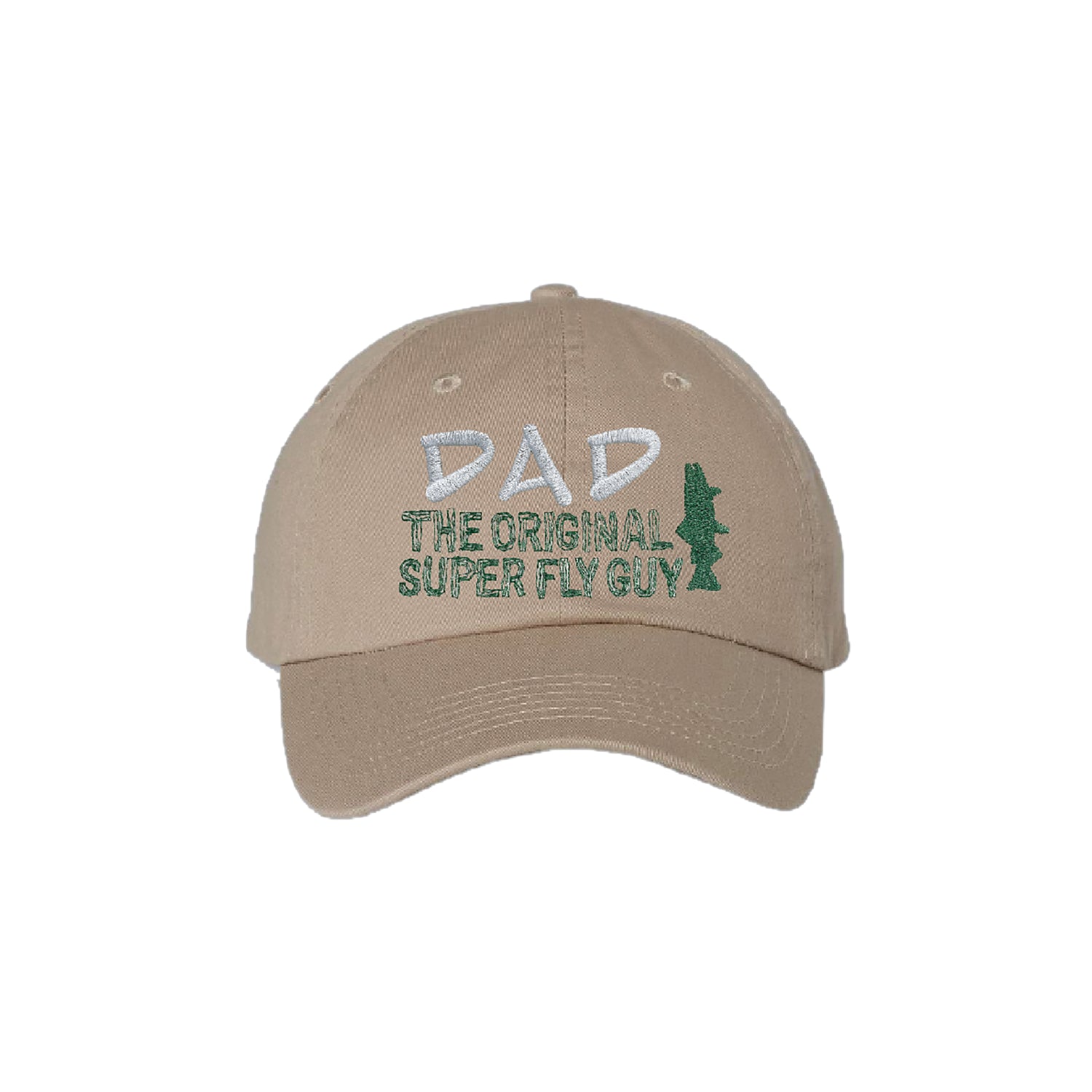 Top off Dad’s look with this classic “Super Fly Dad” cap—perfect for the guy who’s always ready to cast a line or kick back in the great outdoors. The neutral khaki color pairs effortlessly with anything, while the embroidered design proudly reads “Dad – The Original Super Fly Guy.”