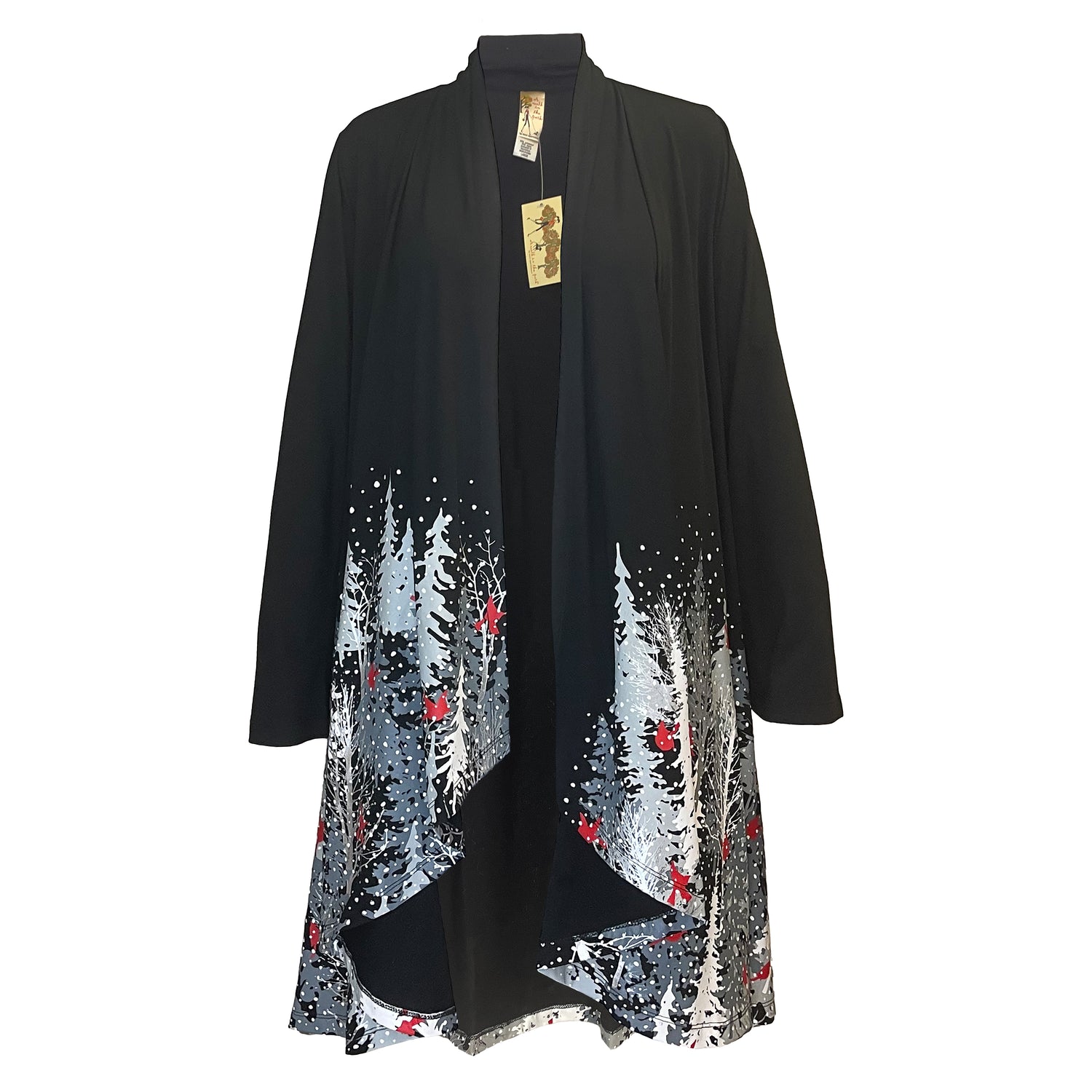 Experience the enchantment of a snowy forest with our Winter Trees with Cardinals Long Sleeve Kimono, and let it bring warmth and joy to your winter wardrobe!