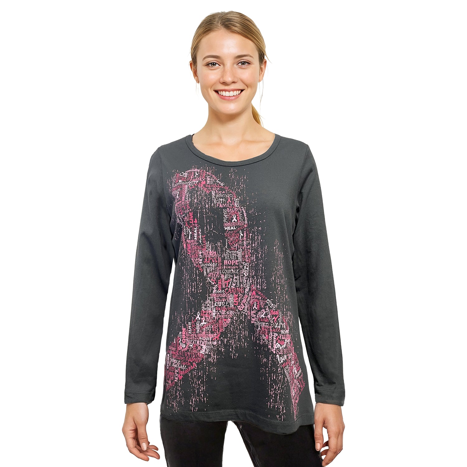 Wear your strength, hope, and courage with this Word Ribbon Breast Cancer Awareness Tee. Featuring a beautifully distressed pink ribbon made up of empowering words like love, faith, survivor, and fight, this long sleeve top is a powerful symbol of support for those affected by breast cancer. The bold design stands out against a dark charcoal grey background, making it a statement piece that spreads awareness and encouragement wherever you go.